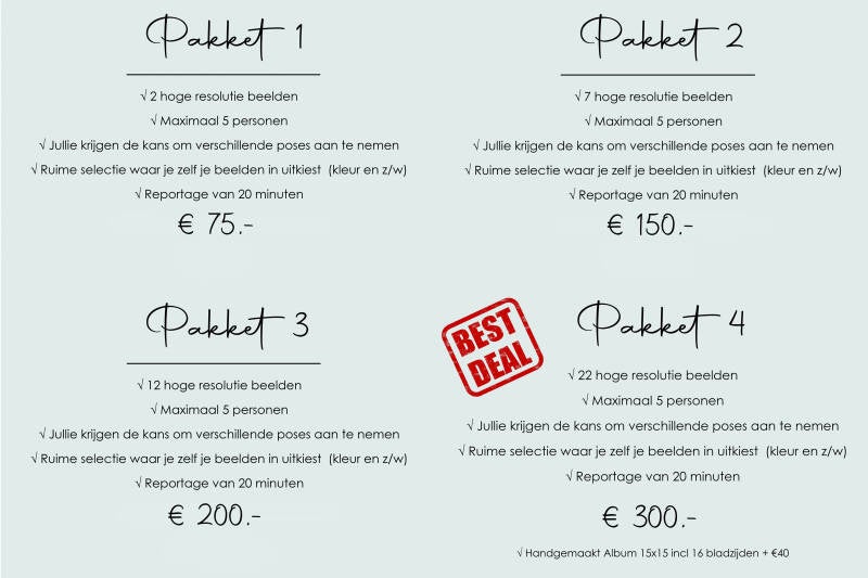 LET OP: deze pakketten zijn alleen op door mij geselecteerde datums & tijden te boeken. Via facebook en instagram maak ik de aankondiging bekend. Wees er snel bij, want deze mini's gaan altijd erg hard!